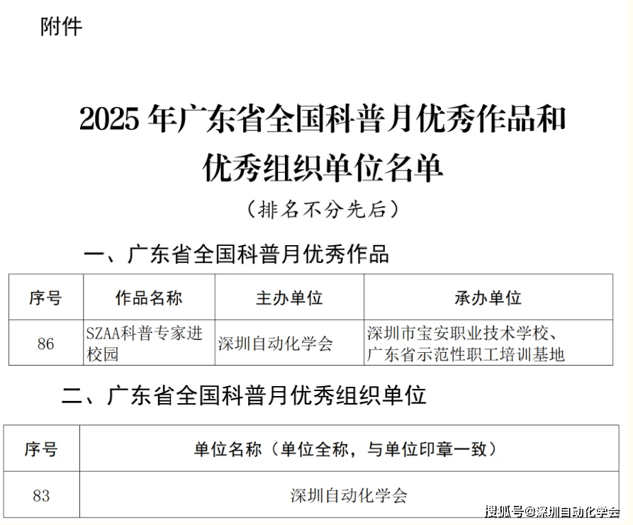 捷报传来,喜讯盈门!近日,广东省科学技术协会正式印发《关于公布2025年广东省全国科普月优秀作品和优秀组织单位的通知》(粤科协〔2026〕1号),深圳自动化学会凭借扎实的科普实践与高效的组织统筹能力,斩获双项殊荣——主办的“SZAA科普专家进校园”活动获评“2025年广东省全国科普月优秀科普活动案例”,学会获评“2025年广东省全国科普月优秀组织单位”,以硬核实绩彰显了学会在科普赋能产业、服务教育中的标杆作用!