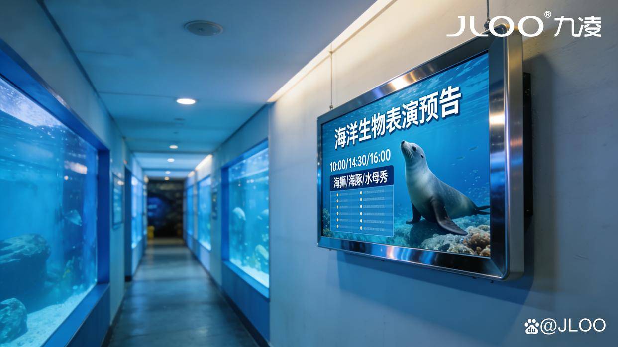 精准传递表演信息:依托九凌JLOO液晶广告机的高清显示与灵活管控能力,实现水族馆各类表演(海豚、海狮、鲨鱼喂食秀等)预告的全方位、无死角覆盖,让游客快速获取场次、时间、互动亮点等核心信息,提升游玩体验。