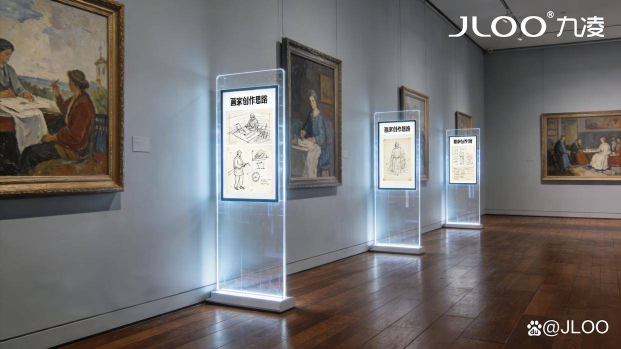 设备搭配:沿廊道、休憩区均匀部署九凌JLOO触摸互动款液晶广告机(建议尺寸43-55寸),每50米部署1台,确保公众可随时参与互动;设备采用嵌入式安装,与廊道墙体融合,不占用公共空间,契合博物馆文化调性。